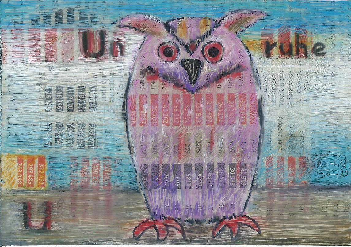 Im Jahr 2020 beschäftigt uns nicht das Reisen, sondern die Corona – Pandemie. Sie ist ein Dauerrauschen im Hintergrund. So überarbeite ich beim zweiten Tieralphabet keine Ansichtskartenmotive, sondern die täglichen Statistiken der Süddeutschen Zeitung, welche die Dokumente dieser Monate sind. Immer wieder dringen sie hinter den Tieren hervor. Nicht mehr die Abwechslung des Reisens ist das Thema, sondern die bedrohliche Monotonie des Lebens in Quarantäne. Das Virus verwandelt unsere Gewohnheiten, unser Denken, unsere Lebensart.
